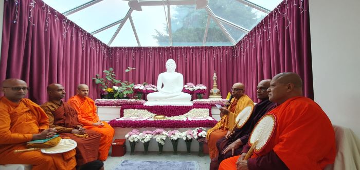 The ceremony was presided over by the Patron and Chairman of the Mission, the Most Venerable Dr Siri Sumana, who formally marked the end of his rainy retreat. The event was further blessed by the presence and Buddhist sermons of several distinguished monastics, including Venerable Hemaratna, Head of Ilford Buddha Vihara; Professor Nuelue Sumanawansa from the Pali and Buddhist University in Colombo, Sri Lanka; Venerable Vajrayana; Venerable Mahanama, Assistant Head of the Sri Sambudhi Foundation, London; and Venerable Seela Dassna of the Forest Meditation Monastery.