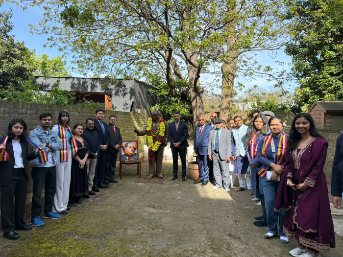 The three-day-long Ambedkar Jayanti celebration commenced with a floral tribute at the Dr Ambedkar Museum at 10 King Henry’s Road, where His Excellency Shri Vikram Doraiswami of India was followed by various members and office bearers of the Federation of Ambedkarite Buddhist organisations, and large numbers of the Indian community, research scholars, academicians, and professionals participated at the museum. They paid their due respect and floral tribute to Babasaheb Ambedkar’s life-size statue in the garden.